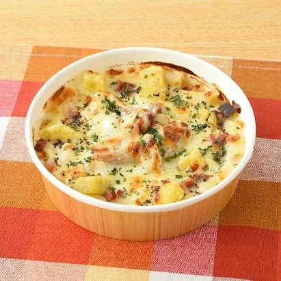 【内容】秋の味覚であるさつまいもと、チキン、マカロニが入った、ごろごろ食感が特長のグラタンです。ホワイトソースは、炒めた鶏皮に牛乳などを加えてクリームソースに仕立てることで、ソースと具材の一体感がアップしました。クリーミーなソースはほくほくしたさつまいもの甘みと相性抜群です。アクセントにスモークしたベーコンとスライスアーモンド、ブラックペッパーを入れることで、美味しさを引き立てました。
