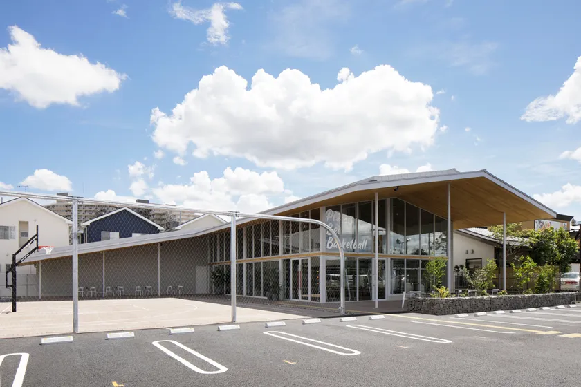 ガラス張りの店内からバスケットコートが眺められます