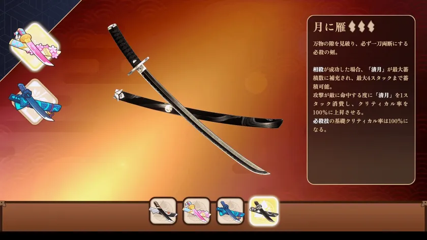 ● 月に雁(つきにかり) :敵の動きを見破り、一刀両断の必殺攻撃を発動します。
