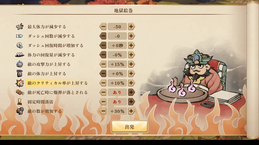さらに、よりハードなプレイをしたい、難しい状況でのプレイを行いたいゲーマーに向けて、今回特別に「難易度上昇システム(地獄絵巻)」を用意しました。挑戦したいデバフ条件を選んで、ご自身の実力を試すことができます!
