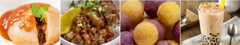 さらに、独特な柔らかい食感と中にたっぷり詰まった肉餡の味がクセになる九分名物「肉圓」、香辛料と醤油で煮た細切り豚肉をご飯にかけた台湾の家庭料理「魯肉飯」。また、食後に必ず食べたくなってしまうスイーツも充実。芋の餡が入ったもちもち食感の「QQボール」、定番の「タピオカミルクティー」など女性やお子様にも大人気の商品を取り揃えました。