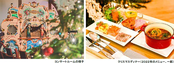 当施設内森の音ホールは、ドイツ風の洋館であることから、「ドイツのクリスマス」をテーマに展示、イベントを行います。森の音ホール内コンサートルームでは、アンティーク・オルゴールなどの自動演奏楽器に囲まれた空間をクリスマスツリーやドイツ製のクリスマスオーナメントを用いた暖かな雰囲気の室内イルミネーションで彩ります。物語の世界のような空間で、自動演奏楽器による讃美歌やクリスマスソングを演奏するコンサートを行うほか、ドイツ製のオーナメントやクリスマスデザインのオルゴールの販売、期間限定カフェメニュー、クリスマス・ワークショップなど、施設全体で街中とは一味違ったクリスマスムードが楽しめます。
