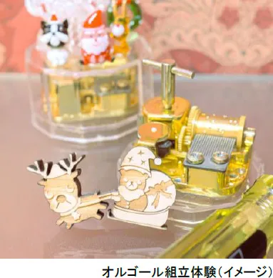 オルゴール職人のサポートのもと、自分だけの音色のオルゴール作りが体験できます。お好みの曲、ケース、コース(一般コース、上級コース)を選んで、完成したオルゴールは持ち帰りできます。心を込めて作ったオルゴールは、クリスマスプレゼントにもぴったりです。