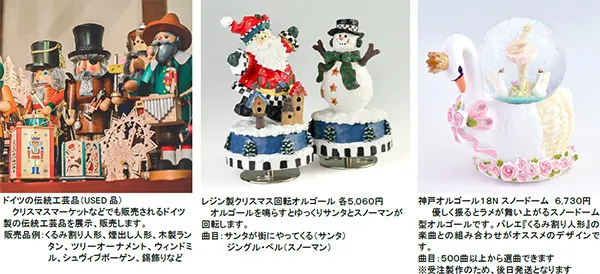 くるみ割り人形や煙出し人形など、クリスマスマーケットでお馴染みのドイツの伝統工芸品やクリスマスプレゼントにもオススメのオルゴールを販売します。