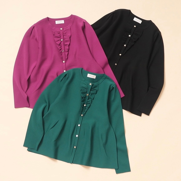 ペプラムシルエットがポイントのカーディガンは、羽織としても単品トップスとしてもご着用いただけます。ややコンパクトなシルエットは、合わせるボトムスを選ばない万能なアイテム。