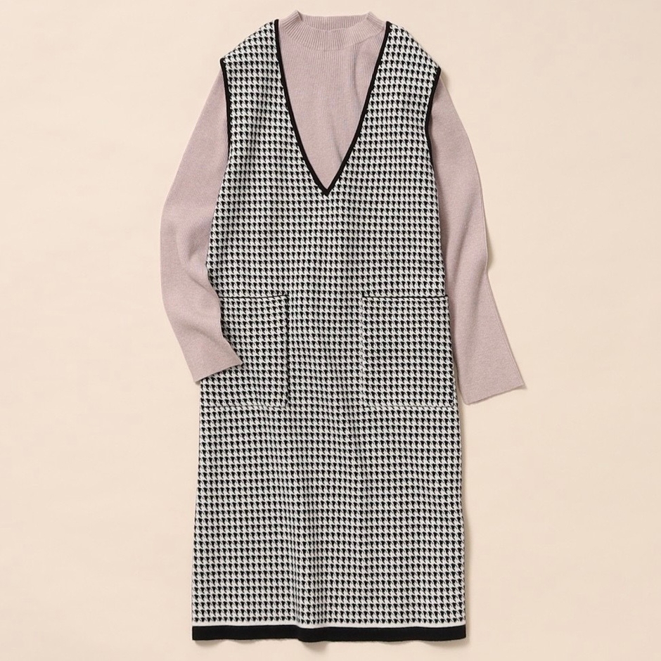 ハイネックのリブニットとニットジャンスカがセットになった洗濯機で洗えるニットアップ。