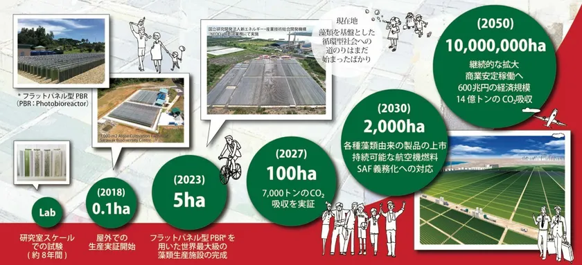 藻類生産設備の大規模化においては、2018年8月に0.1haの設備、2023年4月に5haの設備CHITOSE Carbon Capture Central (C4)を竣工させ、2030年に2,000ha規模、2050年には1,000万ha規模への拡大を計画中です。なお、ちとせグループは今年度、2,000ha規模への生産設備拡大に向けた事業を開始しており、そのうちの100ha規模までの設備拡大および用途開発は、NEDO(※3)のグリーンイノベーション基金/バイオものづくり技術によるCO2を直接原料としたカーボンリサイクルの推進(※4)に採択されております。