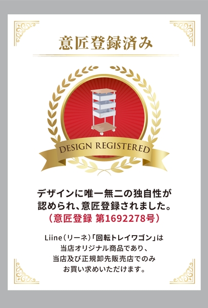 『回転トレイワゴン』は、Liine(リーネ)のオリジナル商品です。最大の特徴である "回転するトレイ" の機構も含め、他にはないデザインとして意匠登録しています。
