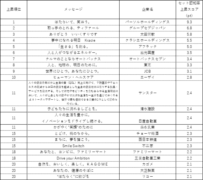 企業名とメッセージをセットで提示して、企業がこのメッセージを発信していることを知っているかどうかを尋ねる「セット認知率」において、前回よりもスコアが最も上昇したのは、「はたらいて、笑おう。」(パーソルホールディングス)、次いで、「取っ手のとれる、ティファール」(グループセブジャパン)となった(表1)。3位は「ありがとう いいくすりです」(太田胃散)。上昇ランキングトップ20をみると、太田胃散の他にも、「夢中になれる明日 Kracie」(クラシエホールディングス)、「ヒューマン・ヘルスケア」(エーザイ)、「人々の健康寿命延伸と生活の質(QOL)向上に向けて、予防医療やウェルネスの観点からお口の健康を起点とした全身の健康増進に寄与する製品・サービスを創造する。そして建物やモビリティを含むあらゆる生活環境において、人々が心身ともに健やかで快適な生活を一生涯を通じておくれるようトータルサポートし、世界で最も信頼できる企業の1つとして認められている。」(サンスター)、「あなたの、健康のそばに」(大正製薬)など、医薬品、健康食品関連の企業が多く入った。コロナ禍を経て、人々の健康への意識や関心が高まり、こうした業界のメッセージと企業名が結びつくようになったようだ。