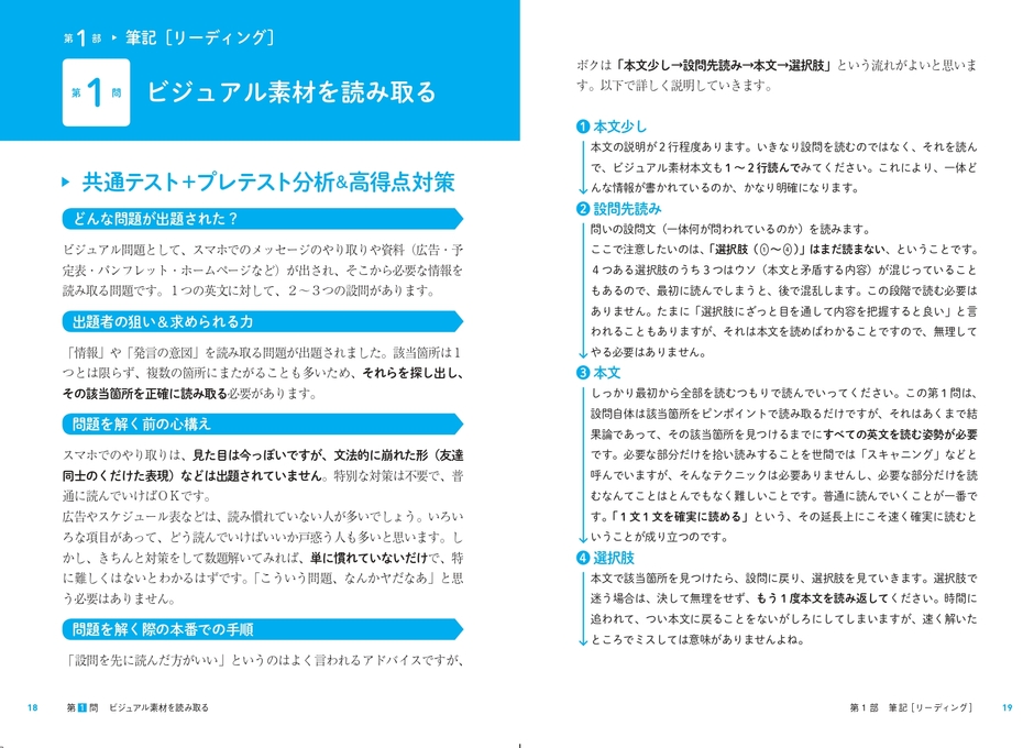 →リクルート運営のオンライン予備校「スタディサプリ」にて、毎年140万人以上に講義を行い、絶大な人気を誇る関正生先生が、第1回共通テスト(2021年1月16日と2021年1月30日実施)の問題と、過去2回の試行調査(プレテスト)を徹底分析。問題の解き方、目のつけどころ、今後の対策などをわかりやすく、かつ詳細まで解説します。本書を読めば、「大学入学共通テスト 英語」の出題傾向がわかり、実際の問題を解くことで全体像を体感することができます。
