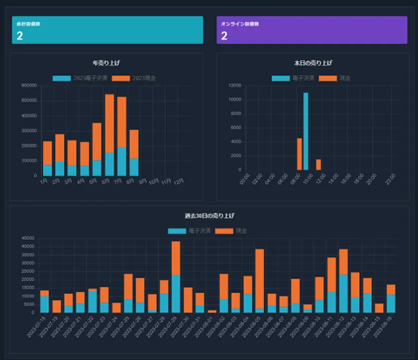 この6台の自販機には全て、「商品管理システム」を搭載。このシステムはQRコード読取系のキャッシュレス端末ですが、現金、QRコード読取双方の売上状況、商品ごとの在庫状況を手元のスマホやPCでリアルタイムに確認ができます。更に、それらの売上データをCSVで出力出来るので、売上分析に適したツールとなっています。