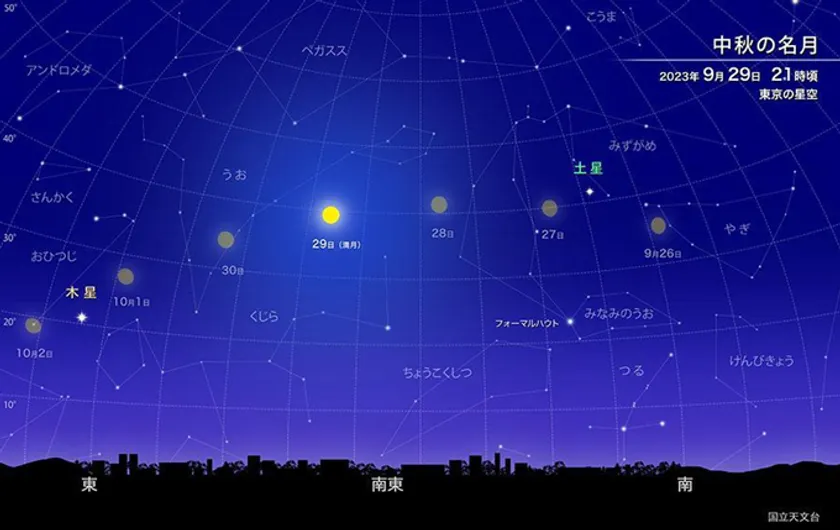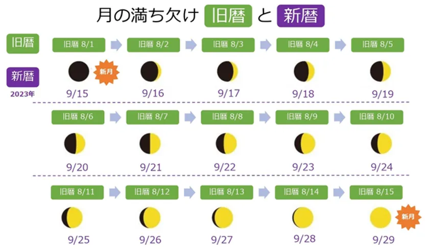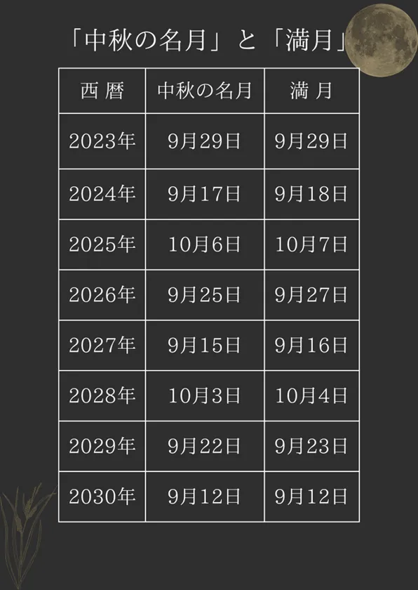 中秋の名月とは旧暦の8月15日に出る月のことで、一年で最も美しい月とされています。秋は気温が下がり、空気中の水蒸気が減るため、月がくっきりときれいに見えます。次に中秋の名月がちょうど満月となるのは2030年9月12日です。秋の澄んだ空気の中、綺麗な月を見上げて、月見団子を食べて秋の実りに感謝することがお月見の風習といわれております。