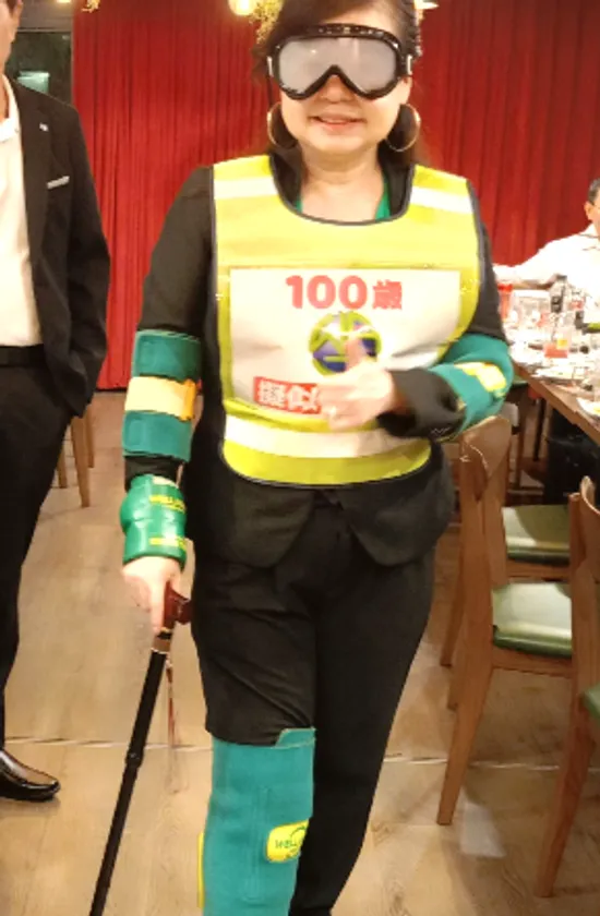 100歳を体験する様子。視界が狭くなるゴーグルと手足に重りを装着