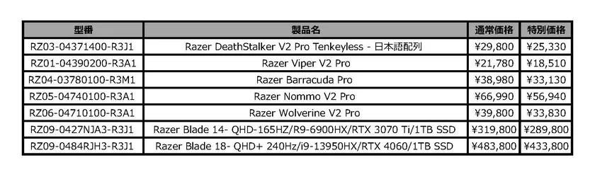 その他にも、60gを切る超軽量設計ながら、99.8%の解像精度を誇り、超高速入力と正確な操作を可能にするワイヤレスゲーミングマウス「Razer Viper V2 Pro」や、PlayStation(R)公式ライセンスを取得したハイパフォーマンスワイヤレスコントローラー「Razer Wolverine V2 Pro」などのプロレベルの性能を備えた製品はもちろん、自動調整ノイズキャンセリングで最高の没入体験を提供するワイヤレスヘッドセット「Razer Barracuda Pro」や、幅広い音域をカバーする豊かな音域と、大音量でもクリアなサウンドを実現するスピーカー「Razer Nommo V2 Pro」などゲーム環境をさらにリッチにする製品が特別価格の対象となっています。