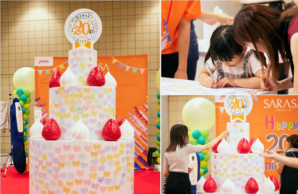 会場で最初に目に入ってくるのは、サラサクリップの20周年を祝う高さ約1.7メートルの巨大バースデーケーキ。サラサクリップを渡された来場者によって、「毎日使ってます!20周年おめでとう!」や「書きやすくてファンです!」、「とても便利です。これからも愛用します!」といったお祝いメッセージで埋め尽くされ、ショートケーキのような白いケーキが数時間後にはカラフルに様変わりしました。