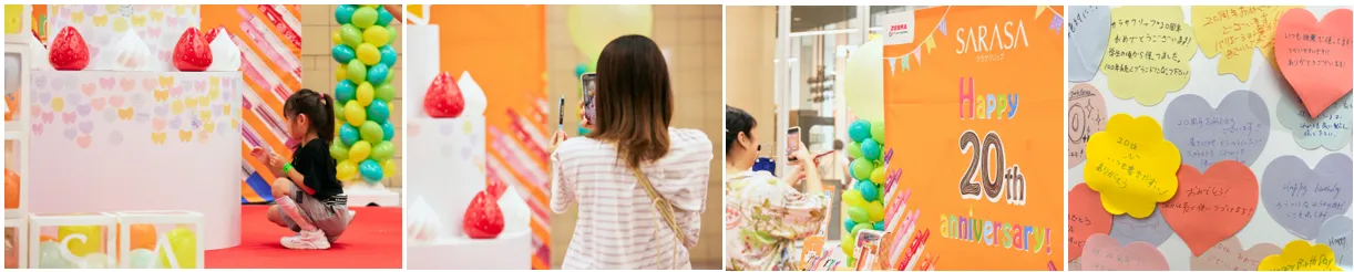 サラサクリップ発売20周年を祝うイベントスペースが渋谷マークシティ マークイベントスクエアに登場。「Happy 20th anniversary!」というメッセージと共に巨大なケーキのオブジェが出現。会場では20周年限定のサラサクリップを来場者に無料でプレゼントし、それを使ってメッセージカードを書いてもらい、巨大ケーキに貼り付けながらサラサクリップの20周年を一緒にお祝いしました。また、20周年限定商品も展示。ご覧になる人がいたほか、「小学校の頃から使っている。サラサの書き心地が好き!」、「季節に合わせて色々な色を使っている」、「手紙をよくサラサで書いている!」、「サラサと同じ20歳!これからも毎日使います」と話す人がいるなど、会場はお祝いムードに包まれました。