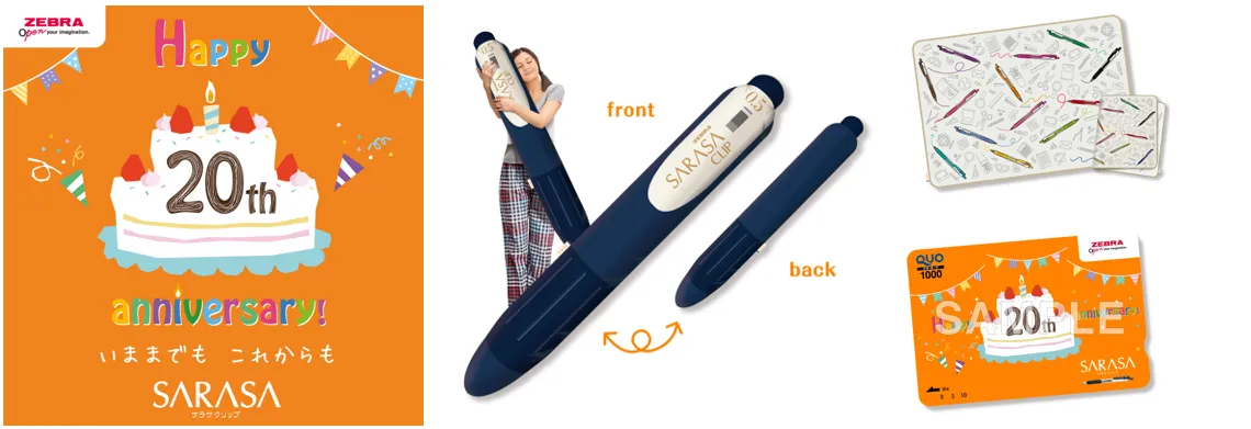 また、2023年9月4日より順次、限定商品を全国文具取扱店(一部)で販売します。20周年オリジナルデザインが施された「サラサクリップ0.5 20周年47色セット」、サラサシリーズ4本がセットになった「サラサ20th ファミリーセット」、アップルやミルクティーなどの香りが楽しめる「サラサクリップ0.5 20周年香り付き」を発売します。さらに、10月31日(火)までの期間、全長約1.45mの巨大サラサクリップ抱き枕などが当たるキャンペーンを実施しています。
