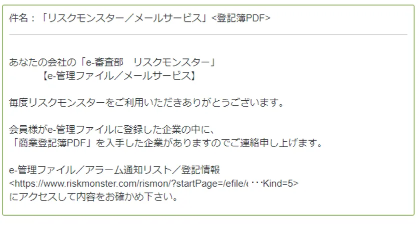 法人会員向けに与信管理クラウドサービスを提供するリスクモンスター株式会社(本社:東京都中央区、代表取締役社長:藤本 太一、以下 リスモン)は、9月17日より、会員企業向けに提供する「e-管理ファイル モニタリング機能」において商業登記簿のアラーム通知およびPDFデータ提供を開始しましたのでお知らせいたします。