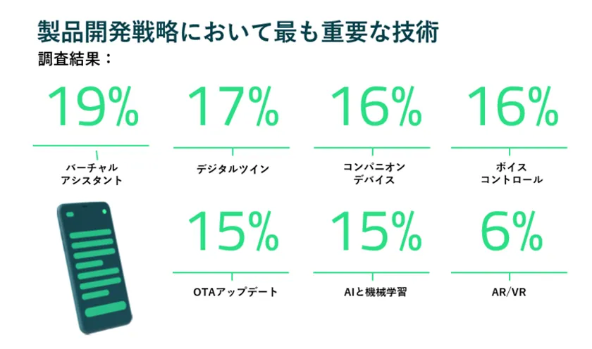 製品開発に最も影響を与えた要因を尋ねたところ、回答者の39%が接続性、32%が相互運用性、30%がAIと機械学習を挙げました。