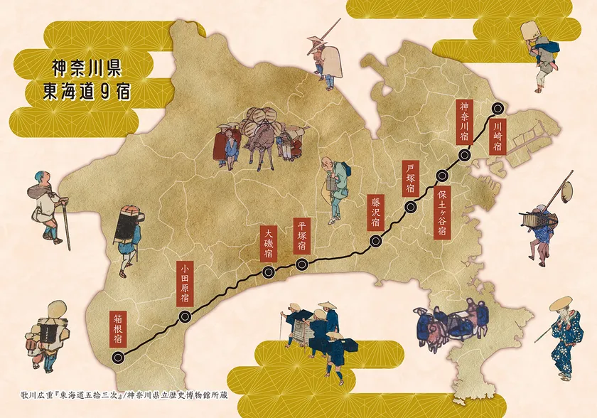 神奈川県の南側には、古来より人・物・情報を繋いできた大動脈、東海道が通っています。江戸時代、東海道には53の宿場が作られ、人や物の流れを円滑にする役割を果たしました。県内には、このうち川崎宿、神奈川宿、保土ヶ谷宿、戸塚宿、藤沢宿、平塚宿、大磯宿、小田原宿、箱根宿の9つの宿場があり、今も多くの史跡が残っています。