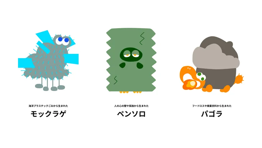 ユーザーがLoopach機能付きアイテムをアプリに登録する際、モンスターは3種類からランダムにLoopachアイテムに紐づけられます。それぞれのモンスターは社会課題をテーマにしており、Loopachを使えば使うほどレベルが上がり、進化しながら、課題が解決された未来の姿へと変わっていきます。