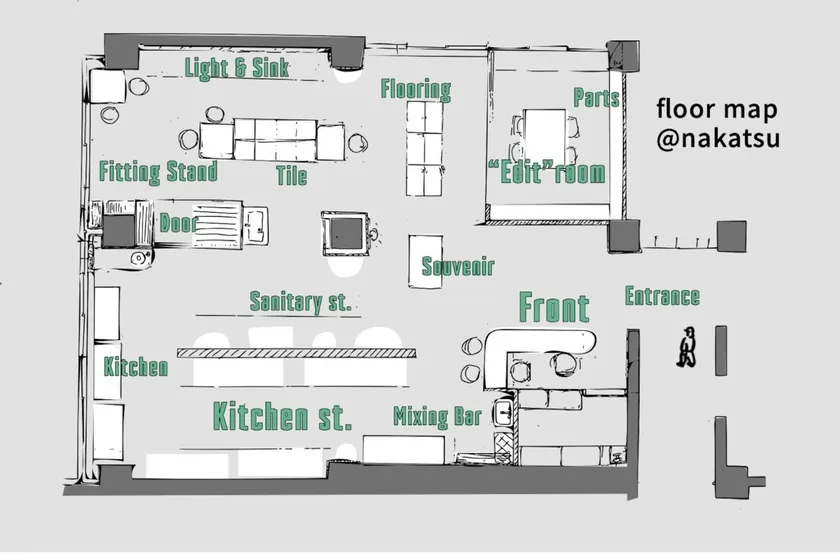 大阪ショールームでは、私たちが大切にしているショールームのコンセプト「理想の答えが見えてくる」を軸に、実現可能な組み合わせ、素材にじっくり触れていただける仕掛けを散りばめています。塗料を試し塗りできる「Mixing Bar」、気になった素材をサンプルで組み合わせることができる「Fitting Stand」、等身大の部屋をイメージして組み合わせを体感できる「“Edit”room」。