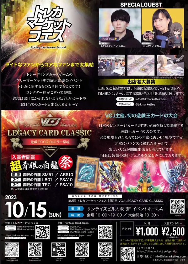 今回開催されるトレカ限定のフリーマーケットイベント「トレカマーケットフェス」では、個人でもお店でも出店が可能なトレーディングカード展示即売会の他に、トレカの開封や音楽タレントなどとして活躍をしている人気YouTuber「わいTV」を招待した人気未開封BOX等が当たるゲストイベントや、約数十万~数百万円で取引をされているコレクターに大人気のカード「青眼の白龍」の鑑定品が賞品となったVintage Card Japan主催の遊戯王対戦「LCC杯」なども行われます。