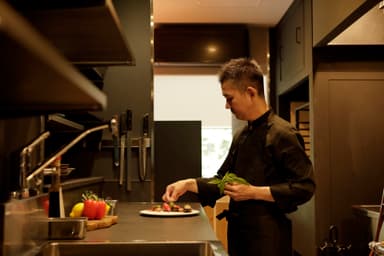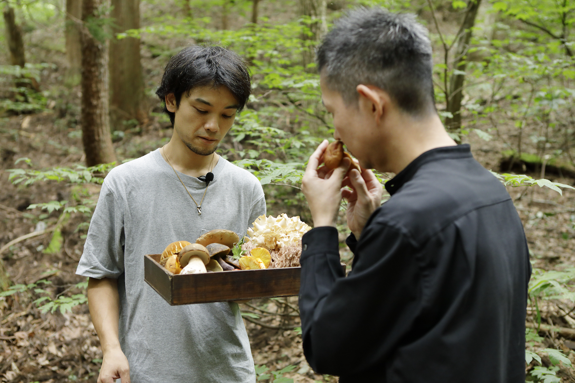 キノコや山菜、ジビエといった山の恵み、長良川の天然魚、農家直送の野菜など、青木 真一シェフが惚れ込んだ岐阜県飛騨地域の旬の食材を、イタリアンのコース料理に仕立てます。主役は、店内に設置したハース(Hearth/炉)で生まれる薪火料理。直火で香ばしく焼く、炙る、炭状になった熾火(おきび)でじっくり火入れする、煙で燻すなど、薪火ならではの自由度の高い加熱法により、食材のうまみを最大限に引き出します。