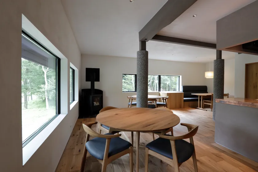 「ひるがの高原リゾート 翠峯苑」が貸別荘として運営していた建物をリノベーションし、木の温もり漂う北欧スタイルの空間をつくり上げました。大きな窓から見える森の景色で自然のおおらかを感じながら、くつろぎのひと時をお過ごしいただけます。また、ハース(Hearth/炉)や薪ストーブでゆらめく炎も、訪れた人の心を癒し、リラックスさせてくれます。