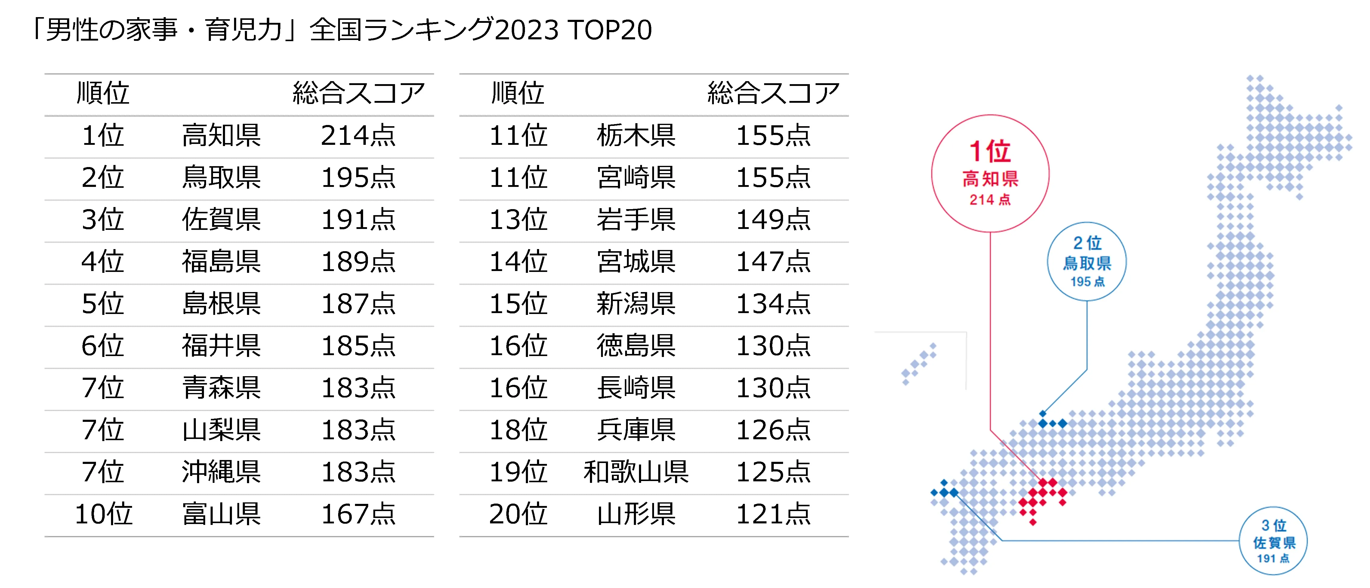 「男性の家事・育児力」調査を都道府県別にランキングした結果、全国1位「高知県」(214点)、2位「鳥取県」(195点)、3位「佐賀県」(191点)となりました。高知県は2022年に続き、2年連続1 位でした。
