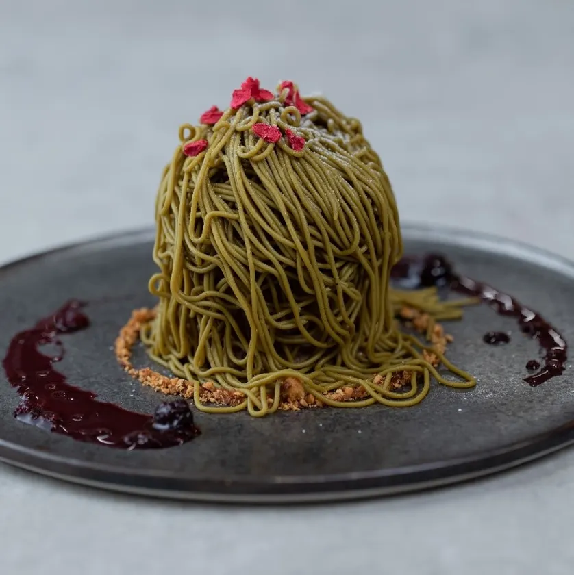 レモン風味のメレンゲ、フランボワーズの香りがふわっと香るアイスクリームの上から和栗に、ピスタチオペーストを練りこんだクリームを目の前で絞ります。濃厚なピスタチオクリームの上にちりばめた、グリーンの刺し色を意識したベリーフリーズドライとベリーソースが酸味のアクセントになっています。贅沢にたっぷりと使用されたピスタチオクリームを楽しめる、食欲の秋にぴったりのENTREカフェ限定ピスタチオメニューをぜひ、ご賞味ください。