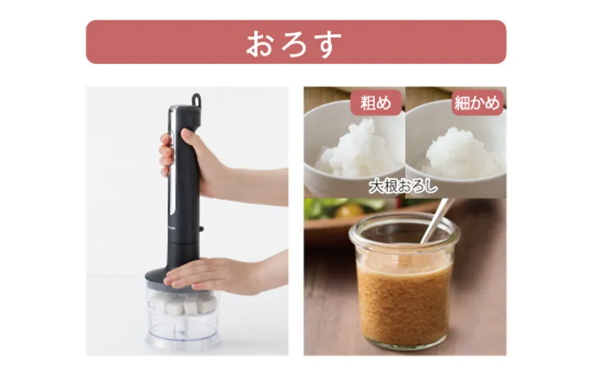 コードがあるタイプと遜色のない、食材をつぶす、まぜる、きざむ、おろす、泡立てるといったマルチな機能性は、調理の下ごしらえやお菓子作り、離乳食など手間のかかる調理時間の短縮や、ワンランク上の調理に挑戦することで料理の幅が広がるなど、毎日の食生活を豊かに彩ります。また、結婚祝い、出産祝い、引っ越し祝いなど、料理を始めたばかりのビギナーズから上級者への贈り物にも最適です。