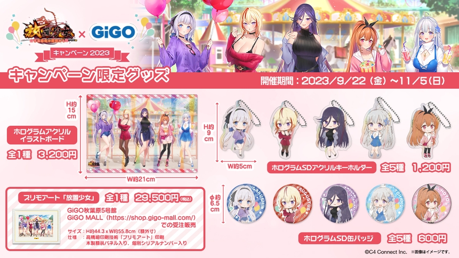 株式会社GENDA GiGO Entertainment(本社:東京都港区 代表取締役社長:二宮 一浩 以下当社)は2023年9月22日(金)より、GiGOグループのお店におきまして、現在サービス中の美少女RPGゲーム『放置少女〜百花繚乱の萌姫たち~』(スマートフォンアプリ及びブラウザ版)(以下、『放置少女』)とコラボレーションした当社限定のキャンペーンを開催いたします。