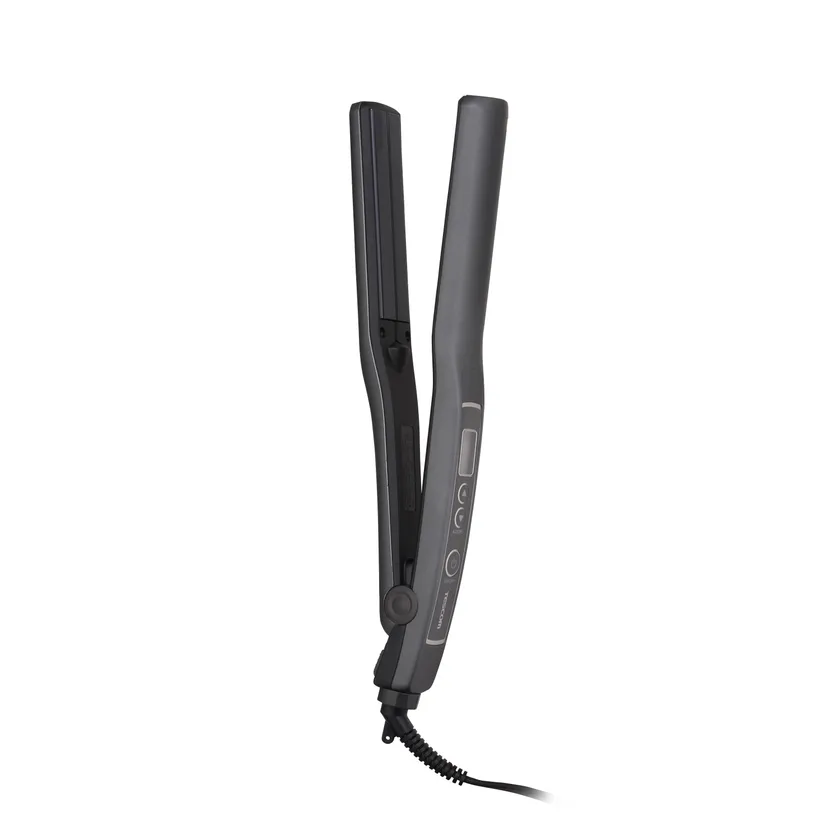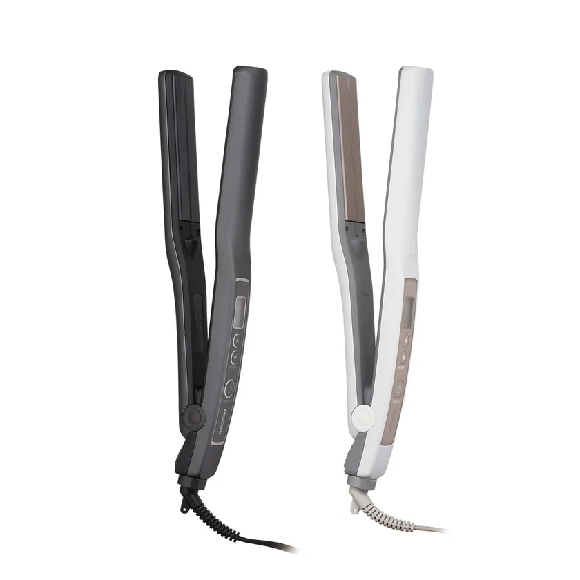髪をいたわりながらスタイリングできるように、髪質やコンディション、スタイリングに合わせて、80~200℃の13段階(10℃刻み)で細やかに温度を設定できる機能や、熱をムラなく伝え、髪との摩擦を少なくしなめらかな滑りを実現するナノセラミックコーティングを施したアイロンプレート、そして静電気を低減するマイナスイオンの放出機能などを備えています。ヘアアイロン前にはスタイリング剤 (※1)を使用でき、髪をケアしながらセットが可能です。
