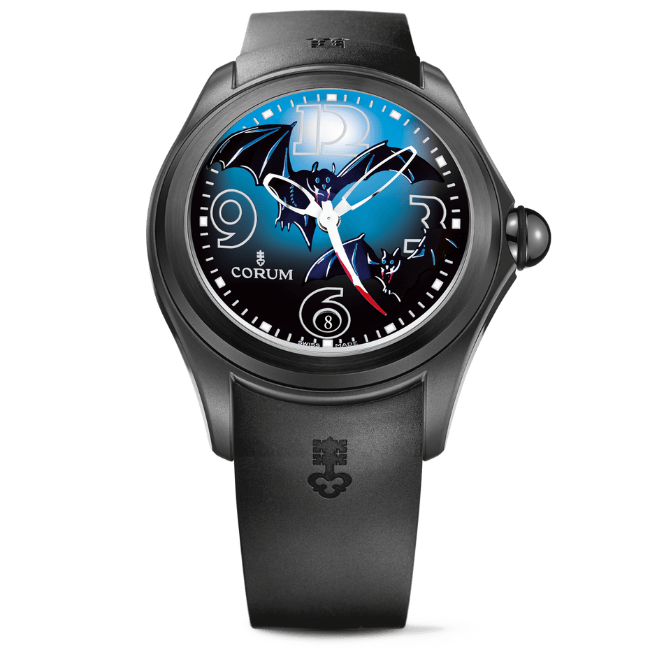 ハロウィンのシンボルであるコウモリをモチーフとする、立体的なプレートを文字盤にセット。月夜に羽ばたく2匹のコウモリがまるでこちらに向かって飛んでくるかのような、躍動感のあるデザインです。先端が赤く尖った斬新な秒針は、コウモリの牙をイメージしています。