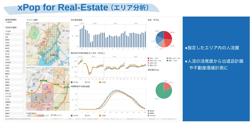 LocationMind xPop(TM)とは、GPSデータを活用し、多様な集計ロジックとその可視化をすることで、業務判断に必要なインサイトの取得や、業務課題解決に向けた人流分析環境を迅速かつ柔軟に構築するためのLocationMind社が提供するサービスの総称です。