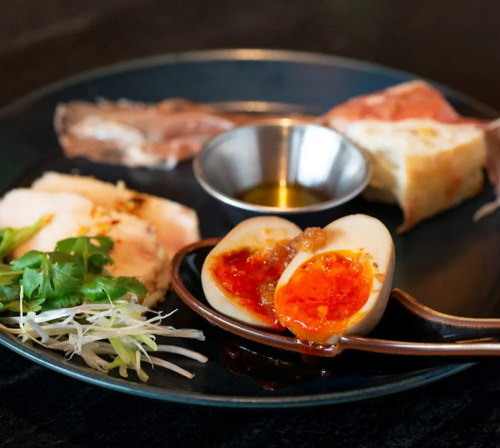 近畿大学薬学部と有限会社マシン・メンテナンス・サービス(大阪府東大阪市)が共同開発した低コレステロールの絶品卵「近の鶏卵」を香り高い中国のたまり醤油・フライドオニオン・ガーリックなどが入ったこだわりのつけダレに24時間じっくり浸け込み、絶品味玉に仕上げました。