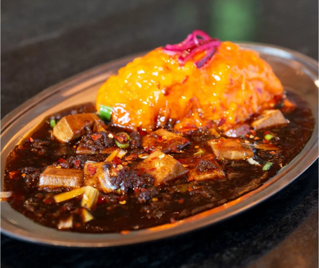 「すするか、すすらんか。」の名物、豆板醤や甜麺醤、唐辛子など7種類の調味料を使用した旨辛やみつき麻婆豆腐を、「ベビーフェイス スカイテラス」でオムライスに合うようにアレンジし、ライス・ふわふわ玉子にたっぷりとかけました。