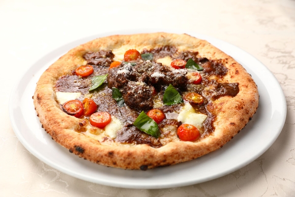 全国トマト選手権で最高金賞に選ばれた稲美町の松井農園のミニトマトと、赤ワインでじっくり煮込んだ但馬鹿のすね肉、モッツァレラ・ブッファラ(水牛のチーズ)を合わせたピッツァ。