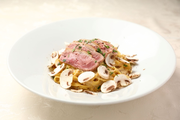自然飼育の但馬鴨と、世界三大キノコのひとつポルチーニ、生食でも味わえるマッシュルーム(六甲シャンピニオン)、淡路麺業の生麺を使ったクリームパスタ。