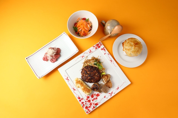 メイン料理は、兵庫県産神戸牛のミンチと脂を使い、贅沢に仕上げた牛100%ハンバーグです。詳しいメニュー構成は以下のとおりです。