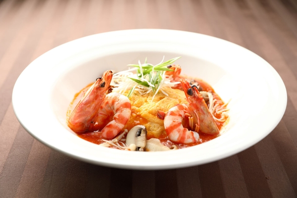 ・明石沖で獲れた足赤海老をチリソースで煮込み、さらに丹波肉厚シイタケなど色々なキノコの香りを足したチリソースをふわとろに焼いた玉子にかけ、仕上げています。