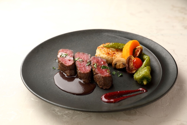 《但馬鹿の背肉のロースト、いちじくと胡椒の効いた赤ワインソース》3,300円(税・サービス料込み)