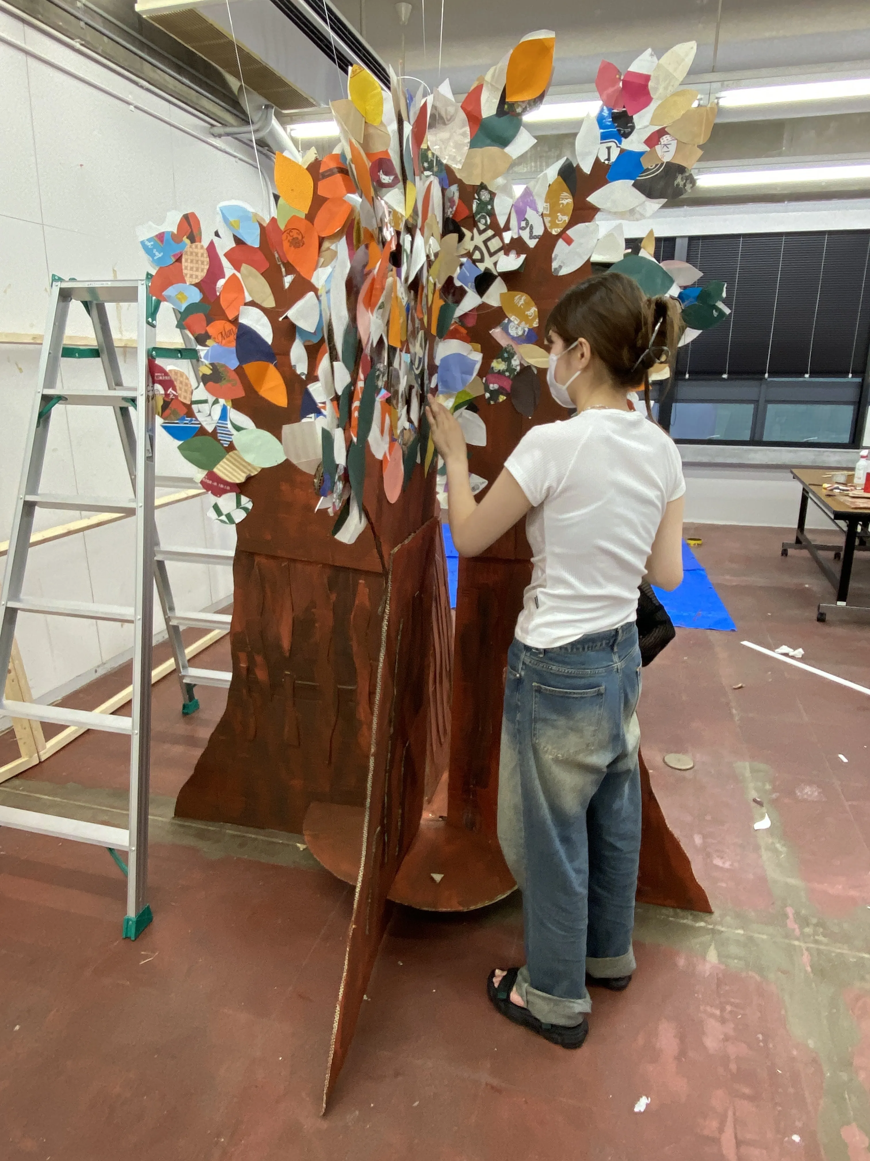 今回は、お客様から回収した紙袋約750枚、お菓子の空き缶約100個と百貨店で不要になったガチャカプセル約50個をアップサイクルしました。不用品を使用して、「自然」「音楽」「関西」「ハルカス」をテーマにしたオブジェを学生が制作し、店内で展示します。