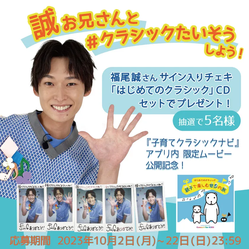 ソニー音楽財団公式X[旧Twitter]( https://twitter.com/kodomo_classic )をフォローし、対象の投稿をリポスト(RT)してくださった方の中から抽選で5名様に、福尾 誠さんサイン入りチェキと、親子で楽しめるCD【はじめてのクラシック~親子で楽しむ世界の旅~】をセットでプレゼントします。詳しくはこちらをご覧ください。( https://www.smf.or.jp/twcp1002/ )
