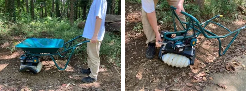 推進器となる部分に砕氷船や雪上車等で使われているアルキメディアンスクリューを採用し、整備されていない草地、山中、ぬかるんだ地面、雪山などの悪路でも対応できる走破性を目指しています。また、前述のような悪路を走行するためのスクリュー(ドリル)走行モードと、舗装された道を走るためのホイール走行モードを簡単に切り替えることが可能です。それにより一台で様々な場所で対応可能となっています。展示ブースに不整地を模したコースを用意しますので、実際にドリルネコ車の操作を体験していただけます。