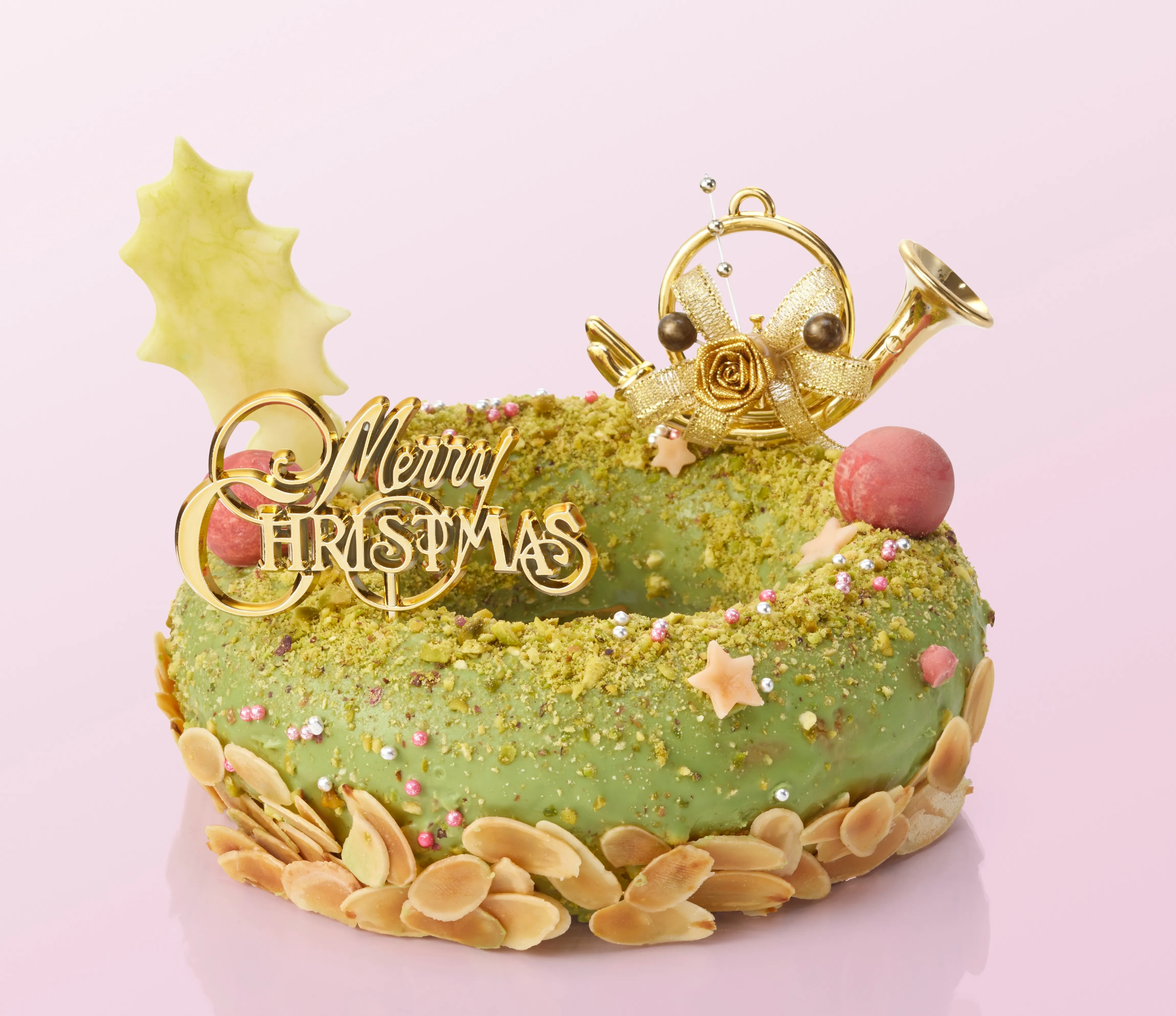クリスマスリースの形を模したバニラのパウンドケーキの中に、りんごやいちごのドライフルーツを混ぜ込み焼き上げました。ピスタチオのチョコレートでコーティングした、ベイクドケーキです。