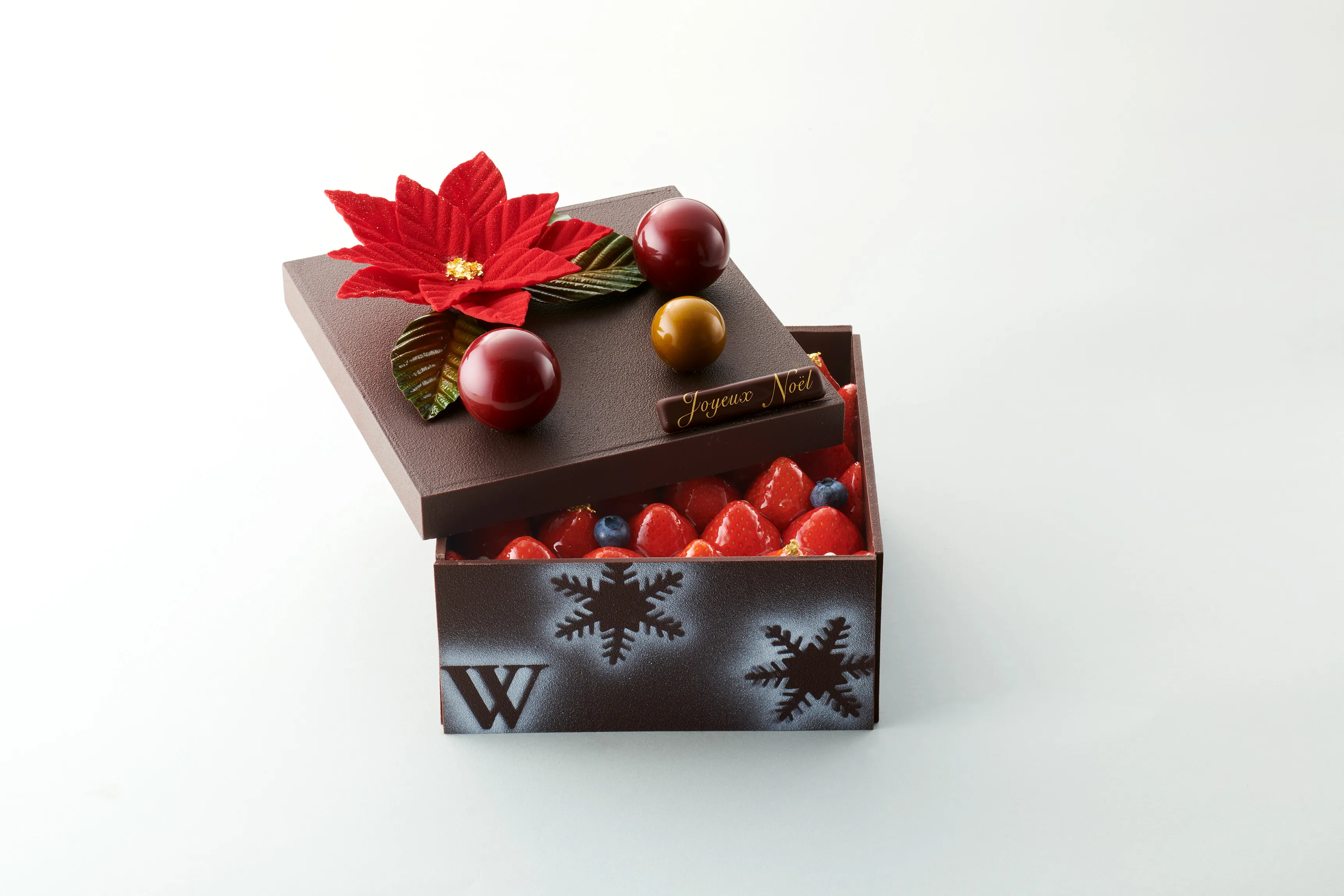 ショコラティエが一つひとつ手づくりした宝石箱のように豪華なチョコレートのプレゼントボックス。ボックスの中にはガトーショコラにラムレーズンを散りばめたミルクチョコレートムースとベリーのムースを重ね、いちごを存分に飾り付けました。ふたにはチョコレートのポインセチアを飾りました。