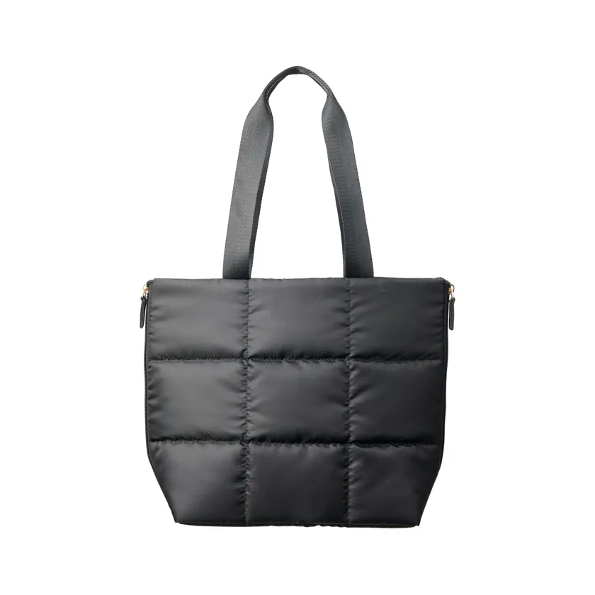 スタイリッシュなキルティングデザインの多機能トートバッグ。荷物の量に合わせて、形を変えられる2WAY仕様。内側には、荷物の仕分けに便利な大小のポケットも。表地は撥水、防汚加工つき。