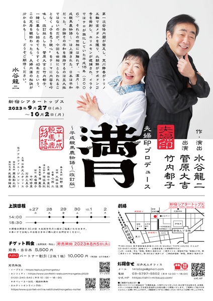 石井光三オフィス主催、夫婦印プロデュース『満月~平成親馬鹿物語~(改訂版)』が2023年9月27日 (水) ~2023年10月2日 (月)に新宿シアタートップス(東京都新宿区新宿3丁目20-8TOPS HOUSE 4F)にて上演されます。